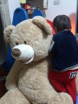 小毛妹看到的第一句話是:好大噢。第二句話是:謝謝爸拔(嗯,很懂得人情世故,知道有禮貌一點,撒嬌一點,以後她爸拔會被她吃得死死的)就開始玩了,太大隻抱都抱不動,但是可以當懶骨頭用,放在客廳小毛妹會坐在在上面跳跳跳,我會坐在上面看電視,但是被念是一定的。還有我其實比較擔心的是……家裡空間已經夠小了,都已經在清空間放東西了,一下子搞這麼大一隻熊要擺那裡呀!!!!