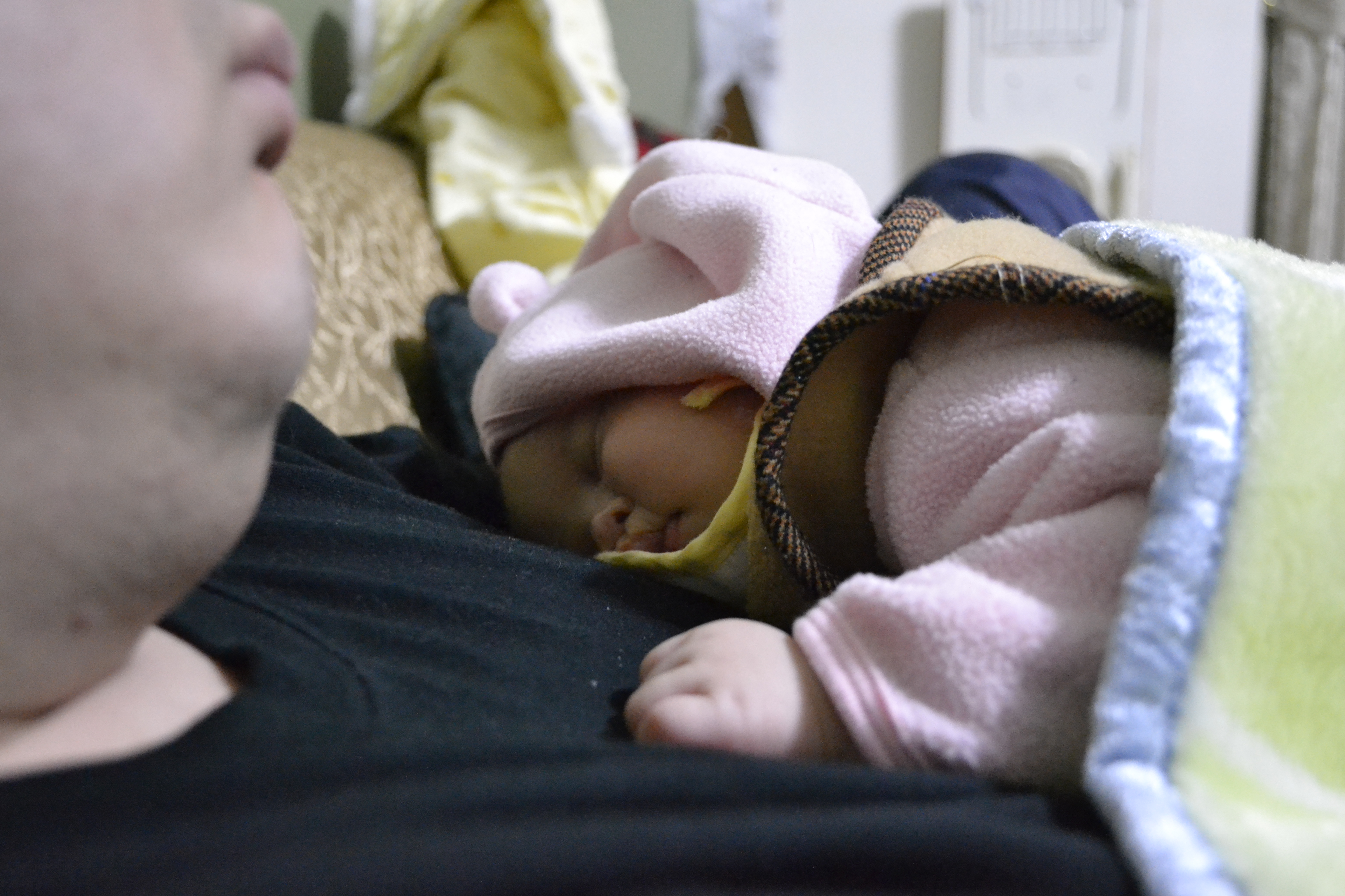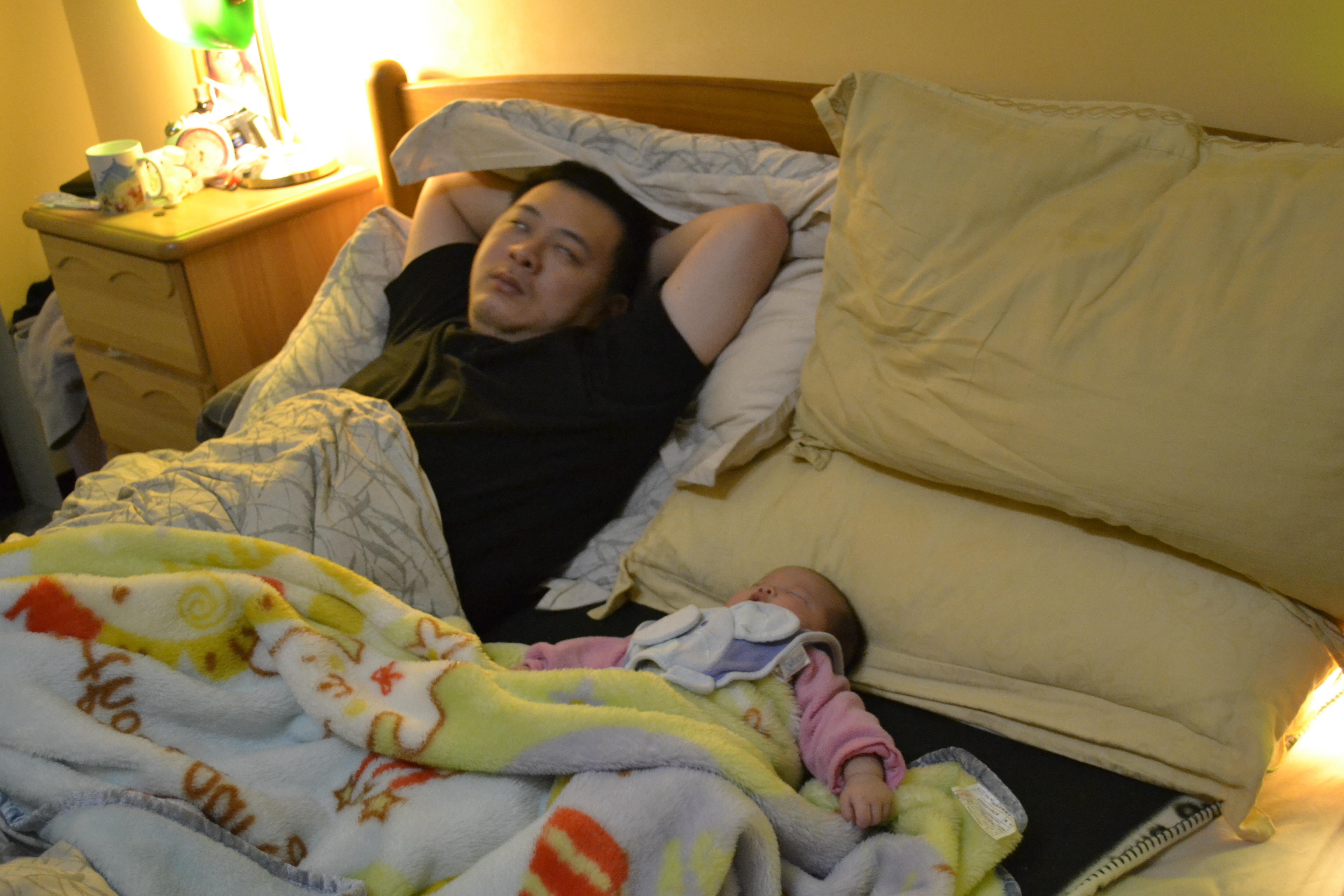 小Juno餓到哭了,媽媽只好又站起來抱她,爸爸有醒過來看了一眼,媽媽以為爸爸要解救媽媽,把小Juno抱過去,結果爸爸瞄了一演繼續睡。(事後爸爸喊冤,他完全沒印象自己有醒)