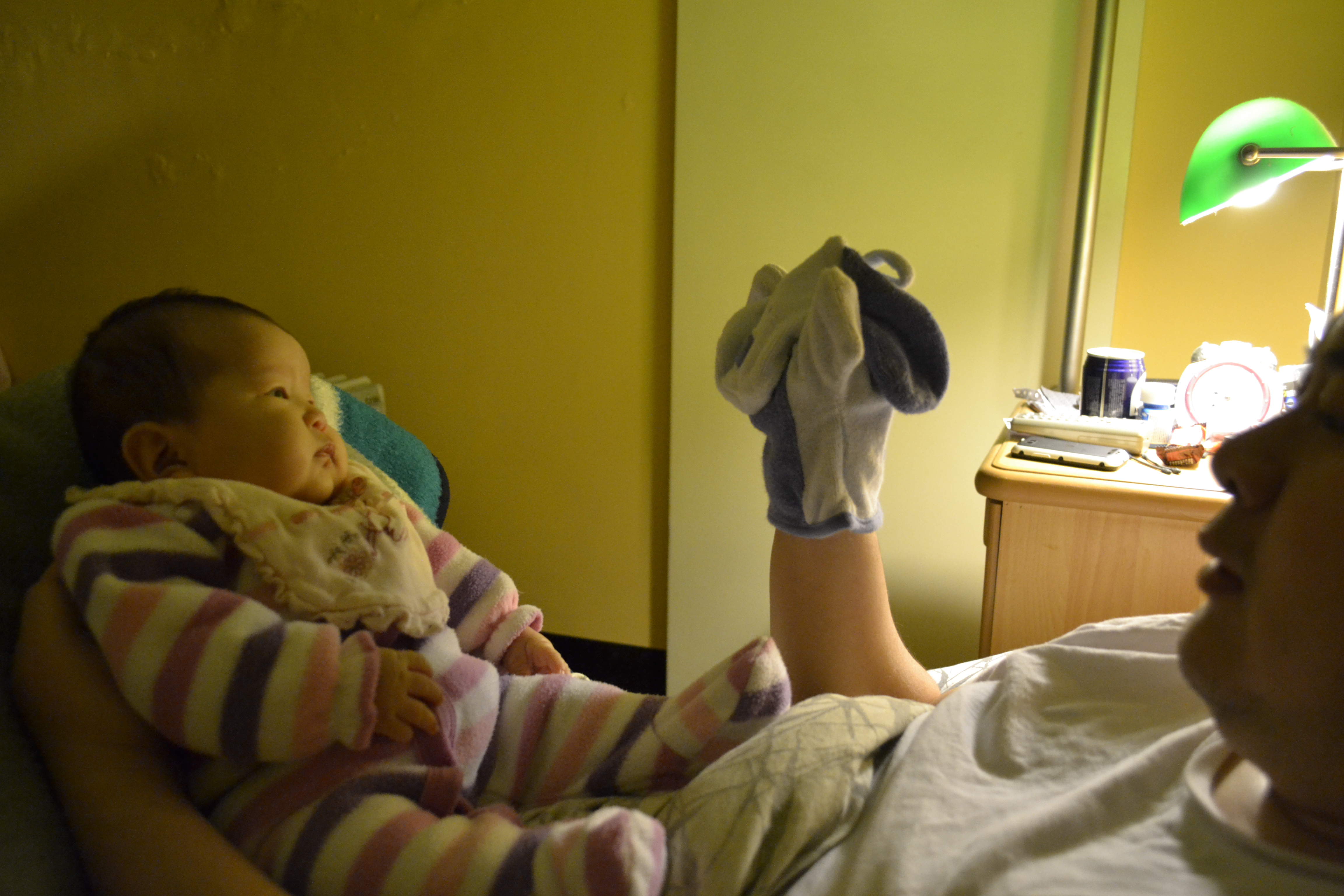 小Juno有醒的感覺,開始磨蹭找食物,媽媽看著小Juno決定跟她玩,幸好小Juno有醒,因為我忘記解凍奶了。