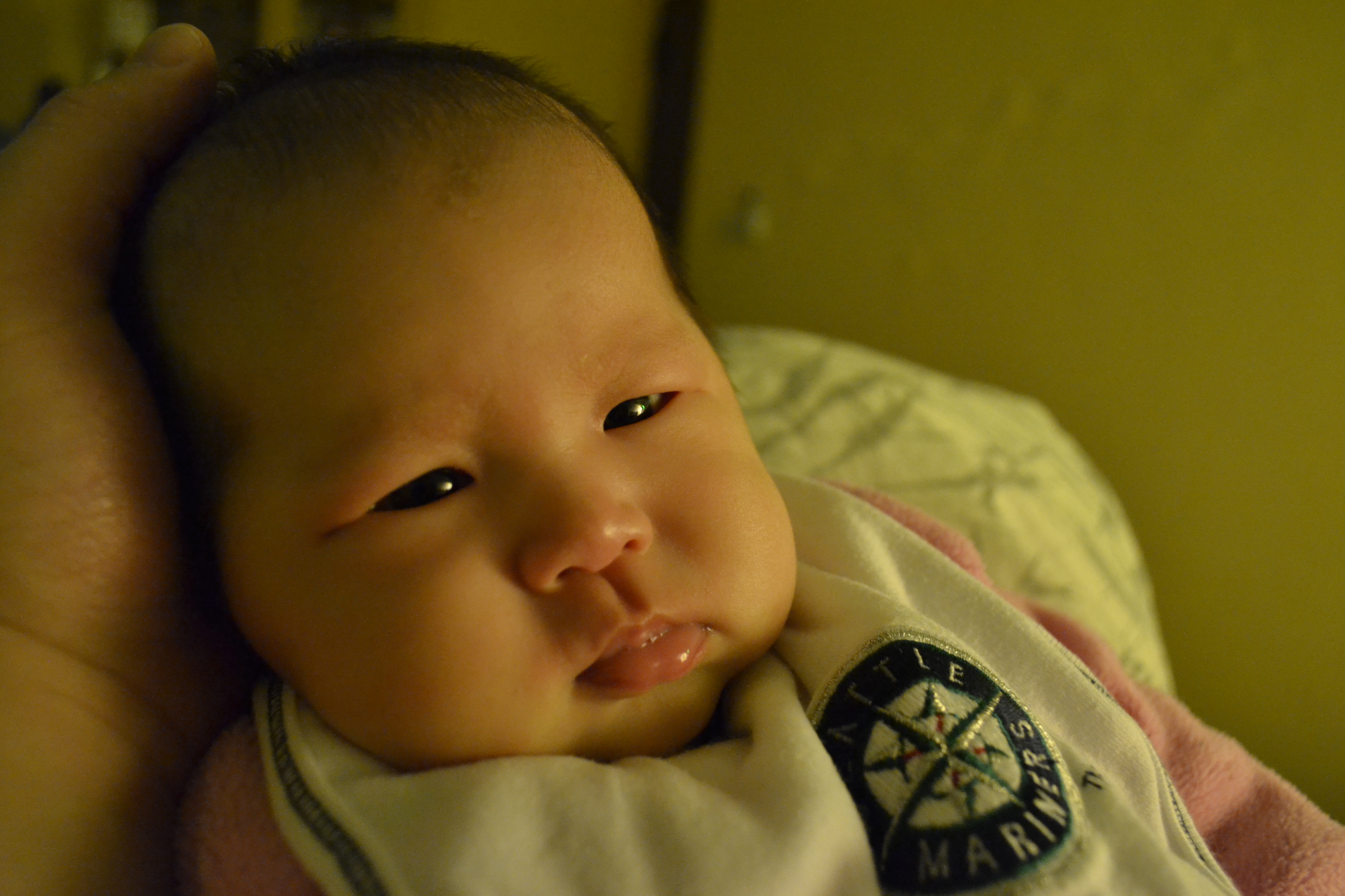 小Juno討厭被擦舌頭跟擤鼻涕,每次幫她擦舌頭上的奶垢跟弄鼻涕時,她會放聲大哭,讓旁邊的人覺得你是不是弄痛她了,(其實我只是輕輕碰到而已說),但是只要停止不弄,她就像是剛剛哭的那麼慘的人不是她一樣,睜著大眼睛看著你。